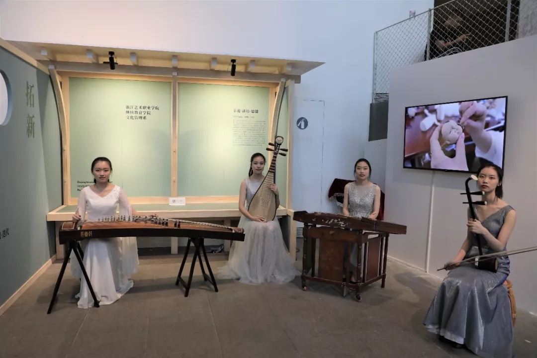 浙艺音乐系4位女生在展区分别用古筝、扬琴、二胡、琵琶演奏的江南丝竹八大名曲之一《小霓裳》为展览增添了别样的韵味。传统乐曲的节奏、旋律,展示了浙艺在民族文化传承上的综合优势,也表明了通过研培让非遗融入生活并不断拓新的空间与可能。