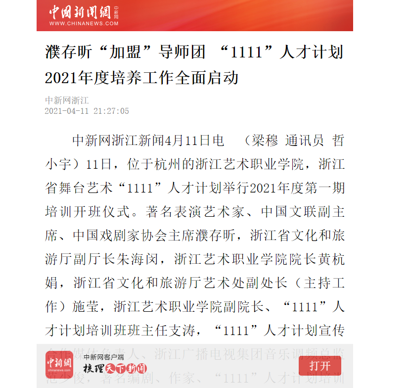 中国新闻网:濮存昕“加盟”导师团 “1111”人才计划2021年度培养工作全面启动