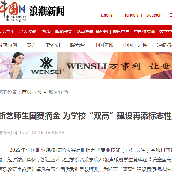 中国网浪潮新闻:浙艺师生国赛摘金 为学校“双高”建设再添标志性成果