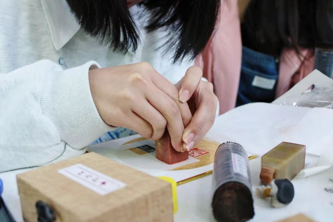 研学中,同学们分别从印章的传拓、钤盖等方面学习上手,并通过覆纸、扫刷、上墨等技法的动手实践,体会到金石篆刻所承载着的丰富艺术形式,也感受到其中所传承着的伟大中华文明。当同学们完成了一幅幅精致的印屏作品时,现场反响热烈,学习氛围浓厚。