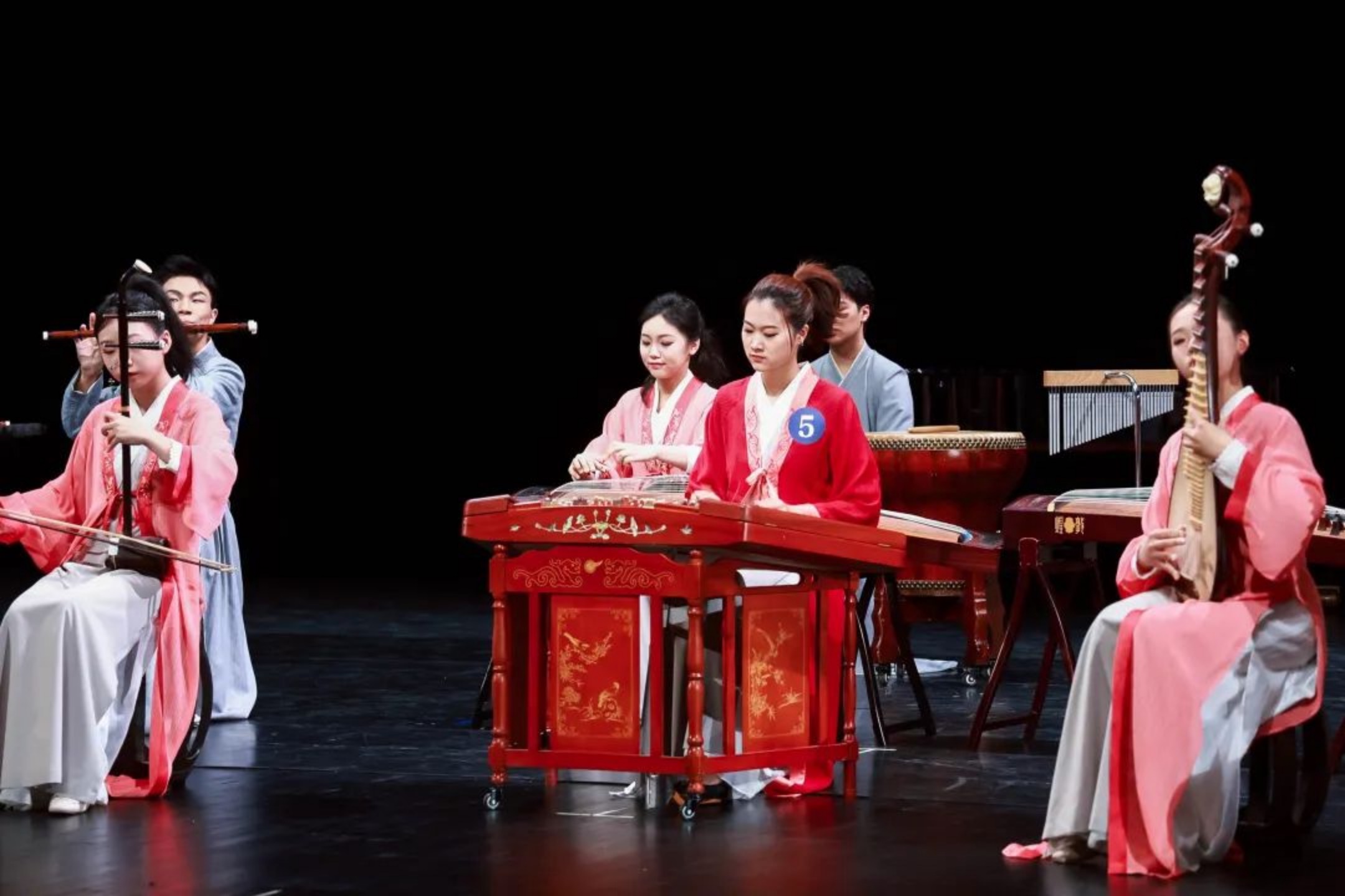 器乐合奏赛场同样精彩纷呈,民族器乐组自选曲目《沙漠玫瑰》让人置身苍茫的西域风情,宛若少女踏着脚铃随风飘来;传统乐曲《春江花月夜》旋律典雅优美,宛如一幅山水画卷,把春天静谧的夜晚景色,一幕幕展现在观众眼前;婺剧《闹花台》在演奏的过程中“闹”出了气氛,闹出了趣味,像民间的闹元宵、闹花灯一样热烈喜庆。