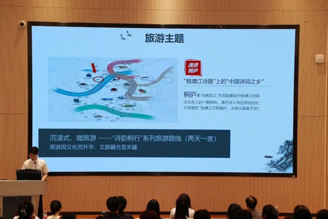 《诗韵桐行》的负责人李晓楠同学分享了策划思路。“诗韵桐行”旅游路线策划小组,围绕浙江省提出的以“‘诗’”串文为主线的诗路文化带,聚焦钱塘江诗路文化带上的“中国诗词之乡”—桐庐,对旅游市场的现状进行了深入的分析,策划了具有实际价值和一定市场竞争力的方案。他表示,很荣幸在指导老师蒋曼曼和全体组员的共同的努力下,策划方案荣获一等奖。接下来他们将继续努力学习策划技能,将课堂所学与实践充分结合,策划出更多可操作且具有实用价值的方案。