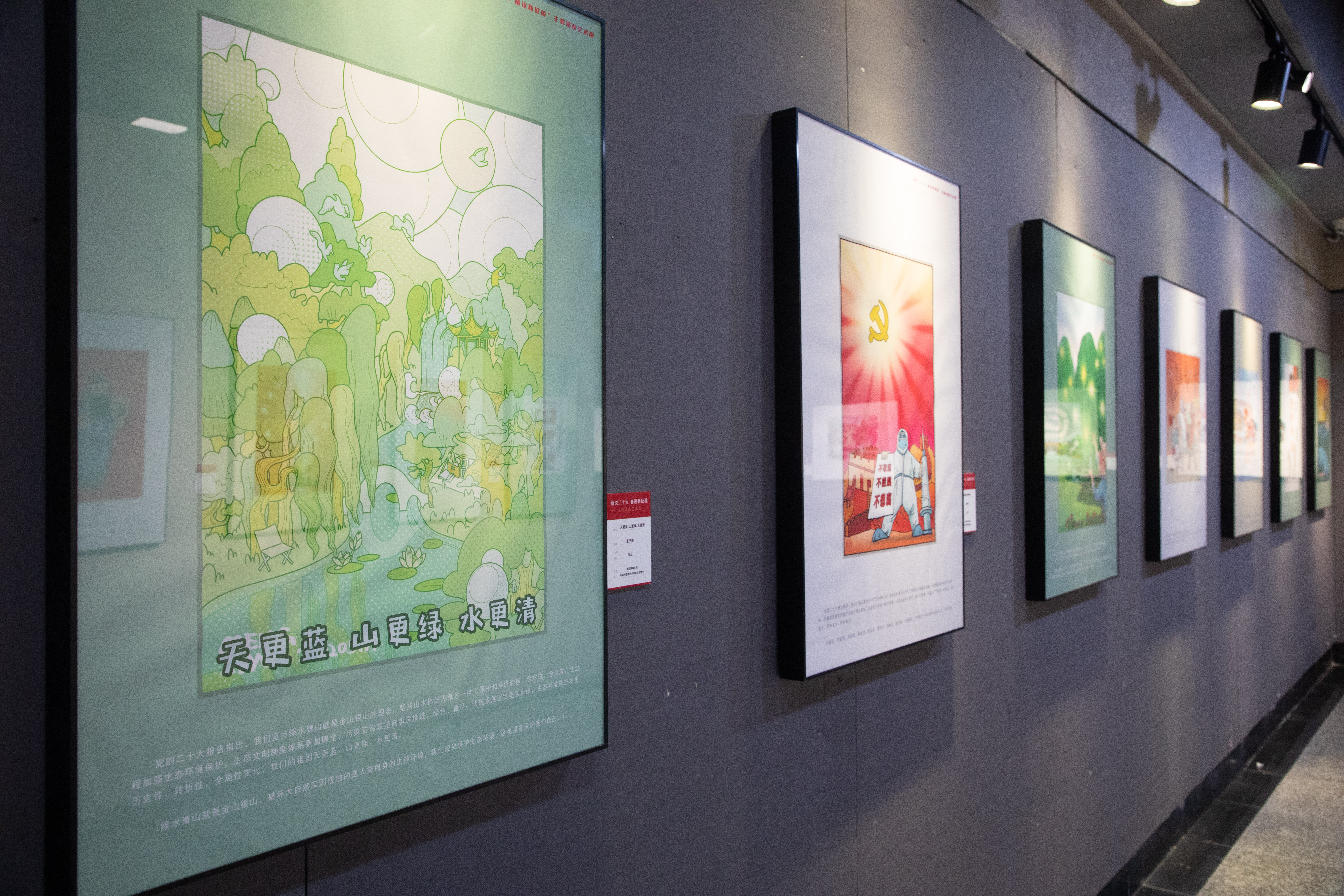 用漫画艺术宣传中国共产党全国代表大会精神,这在浙江历史上是第一次,在全国也是首创。本次展览集中展示了来自21个省(市、区)的知名漫画家创建的风格各异、形式多样、内涵深刻的60余幅作品,既有传统漫画,也有绘本插画,还有数字绘画,从不同的视角将党的二十大精神内容刻画得更富新意境,彰显出更具形象感。