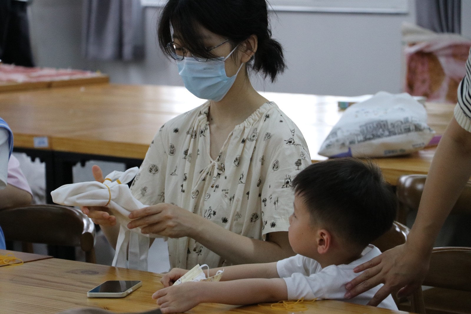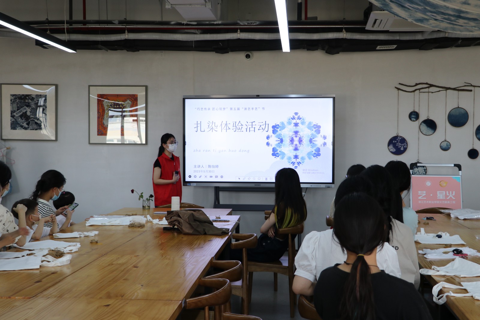 扎染古称扎缬,是汉族民间传统而独特的染色工艺。艺小匠耐心地从扎染的原料、技艺、制作思路、应用效果等方面作了详细讲解,并为体验者们准备了丝巾、帆布包等不同的样式物品进行染制。