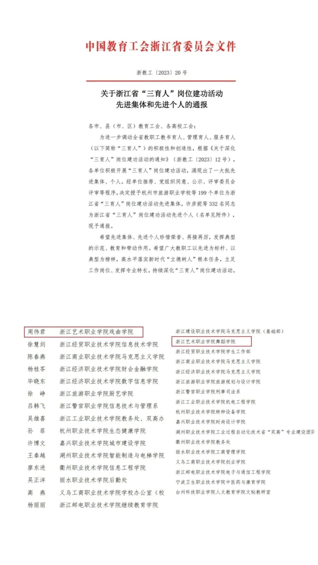 教师节来临之际,浙江省教育工会发布《关于浙江省“三育人”岗位建功活动先进集体和先进个人的通报》,我校舞蹈学院荣获浙江省“三育人”岗位建功活动先进集体,戏曲学院院长、教授周伟君荣获浙江省“三育人”岗位建功活动先进个人。
