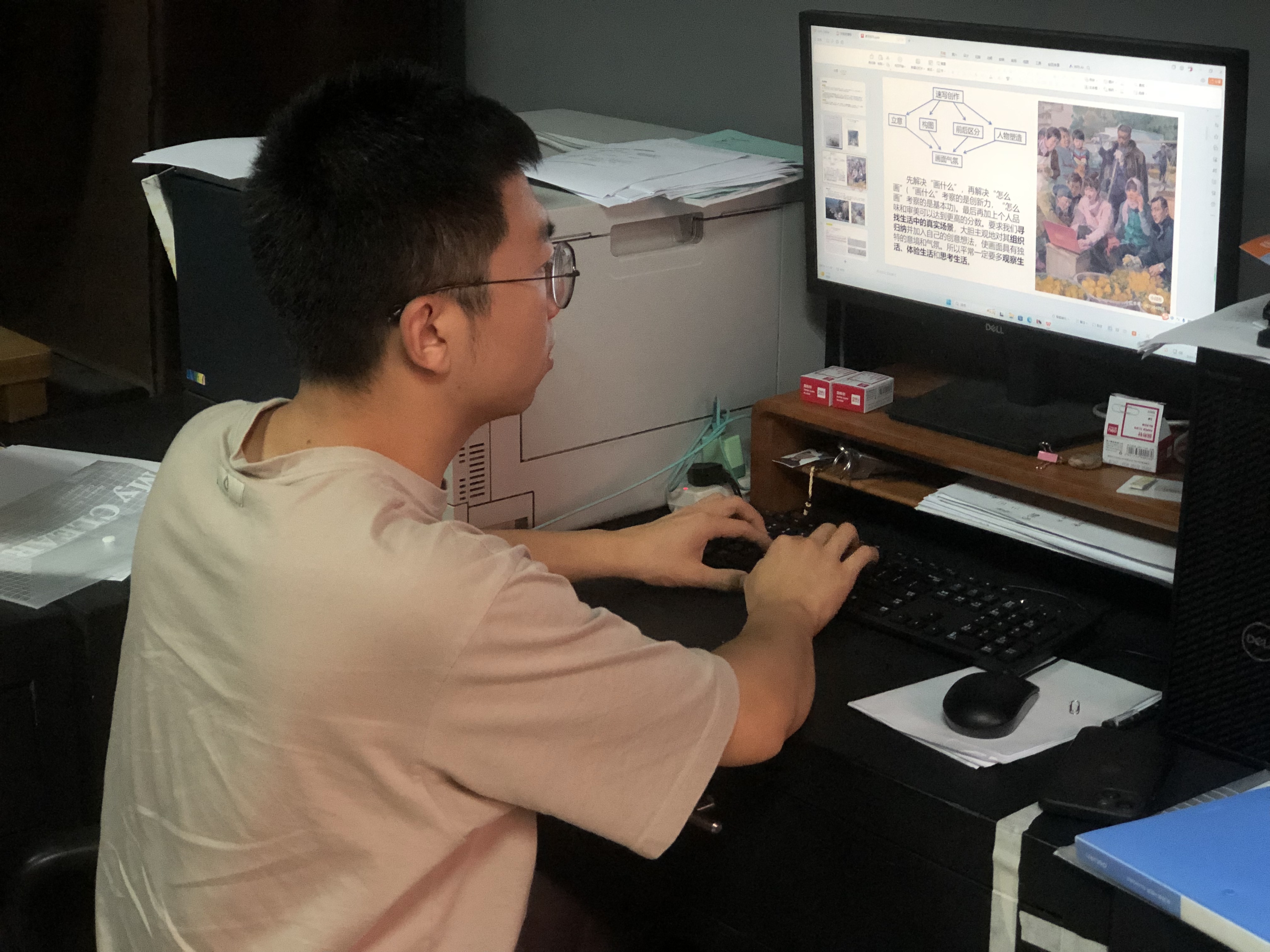 经层层选拔,陈策在校赛中脱颖而出。设计学院造型基础(附中美术)教研室开始积极准备决赛。备赛期间,陈策与教研室团队反复研讨,不断磨课,精进教学能力,调整教学课件。