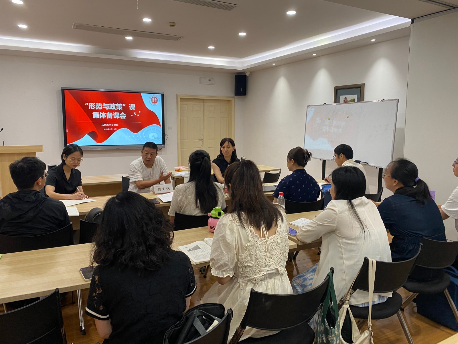 为更好落实习近平总书记关于思政课建设的重要指示和党的二十届三中全会精神,推动学校思政课建设高质量、内涵式发展,更加及时、准确、深入地推动习近平新时代中国特色社会主义思想进教材、进课堂、进头脑,9月10日,马克思主义学院召开“形势与政策”课备课会,围绕教育部2024年秋季学期全国高校“形势与政策”教学专题展开研讨。党委委员、宣传部部长、统战部部长傅文钢莅临指导,马院领导班子及全体教师参会。
